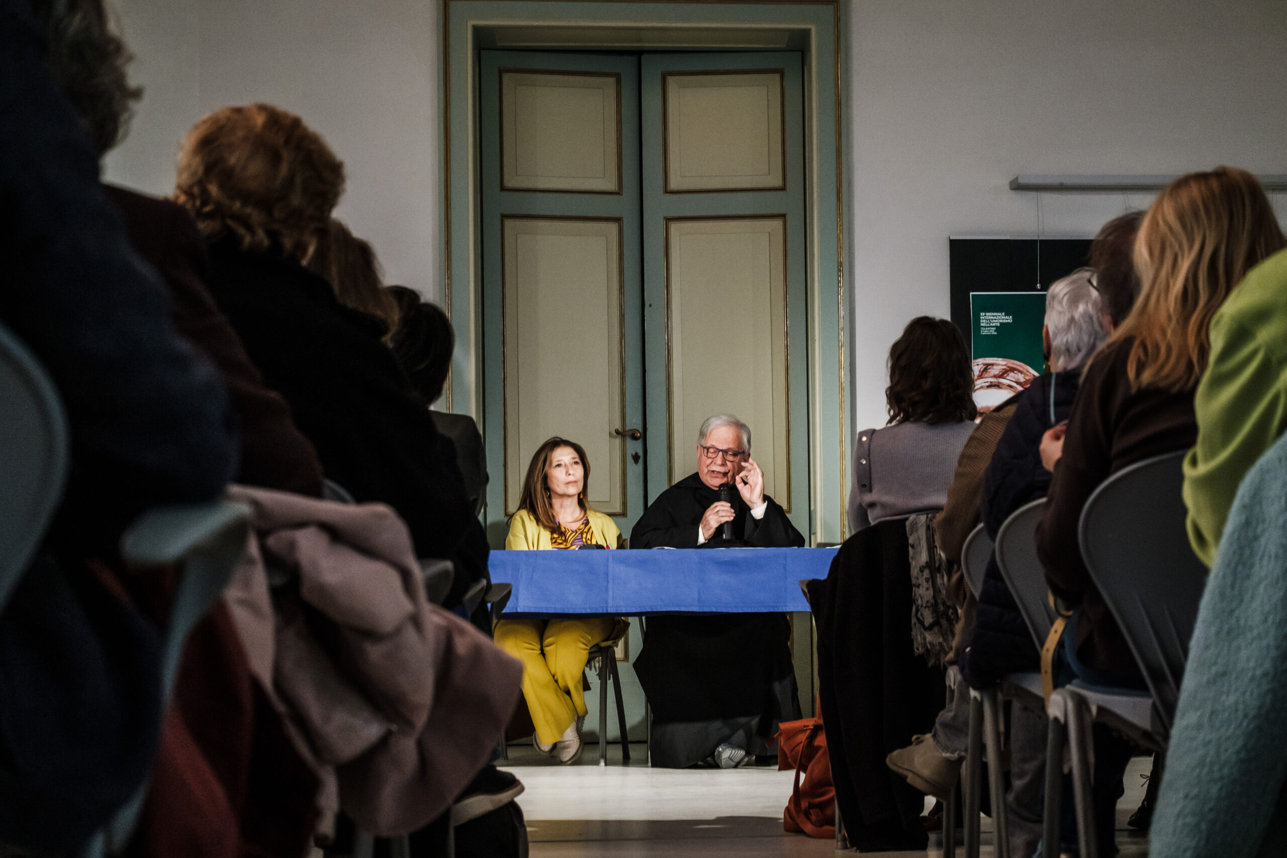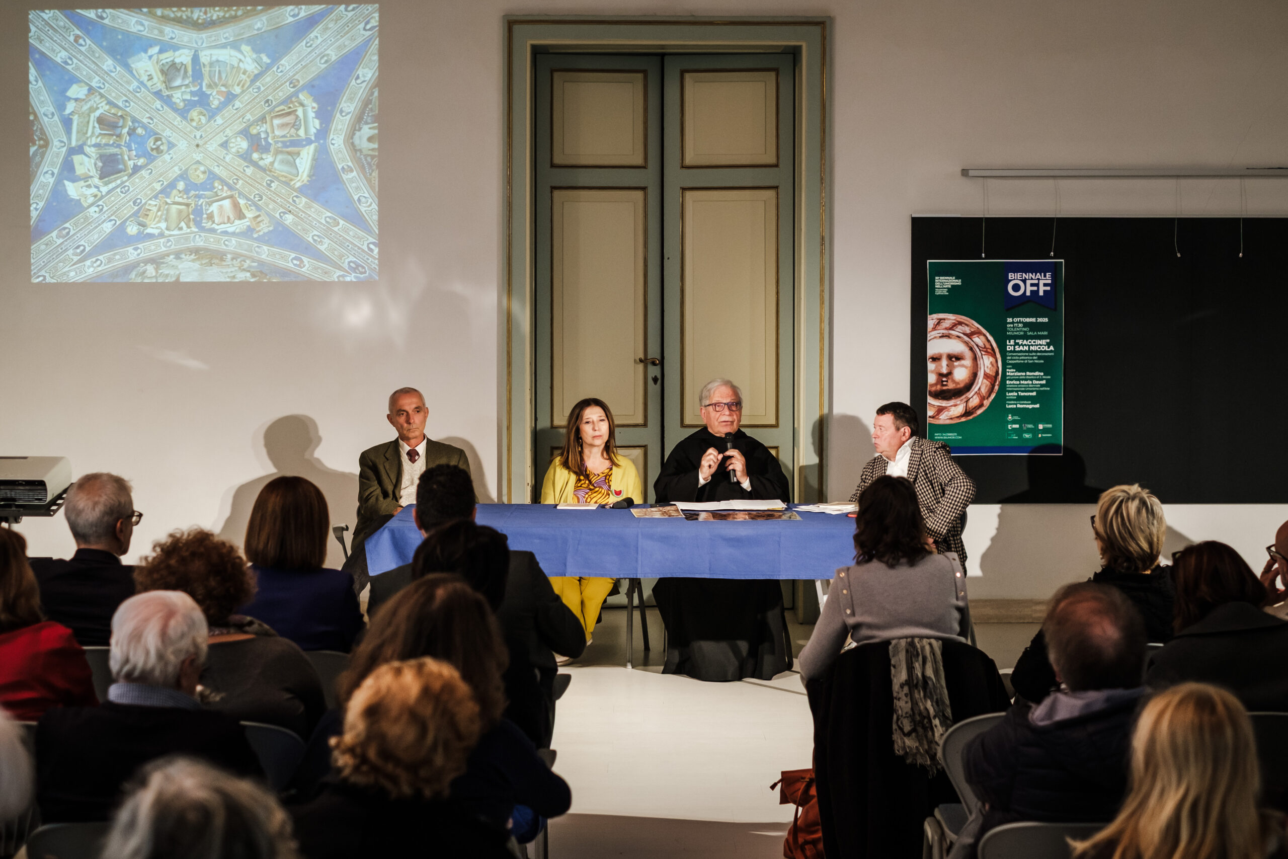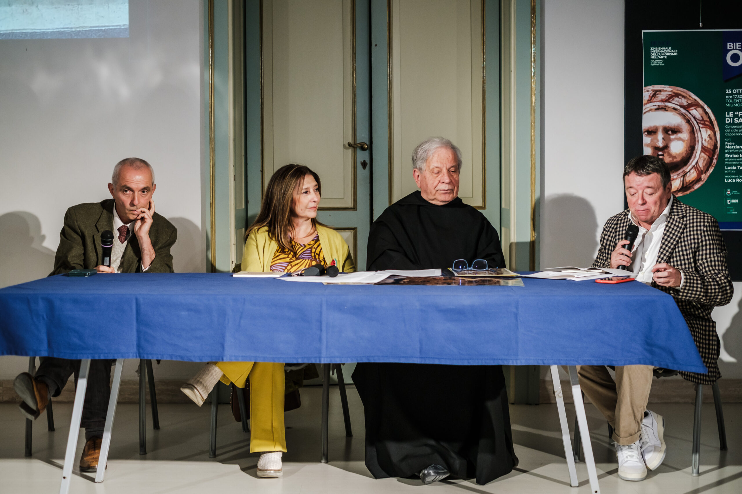 Sempre nel pomeriggio, a Palazzo Sangallo, al Museo dell’Umorismo, nella Sala Mari, interessante quanto partecipata conversazione a tre voci dedicata ad analizzare da diversi punti di vista le “Faccine” di San Nicola, le particolare decorazioni del ciclo pittorico del Cappellone. Padre Marziano Rondina, già priore della Basilica di San Nicola e di San Giacomo a Bologna, Enrico Maria Davoli, Direttore artistico Biennale Internazionale Umorismo nell’Arte, Lucia Tancredi scrittrice hanno intrecciato argomenti, suggestioni e riflessioni sulla singolarità di questi straordinari elementi pittorici inseriti all’interno del celebre ciclo di affreschi della “camera pinta” di San Nicola, quasi fossero antenati degli emoticon ma che certamente, nelle loro espressioni, riflettono i nostri stati d’animo. Ha moderato Luca Romagnoli.